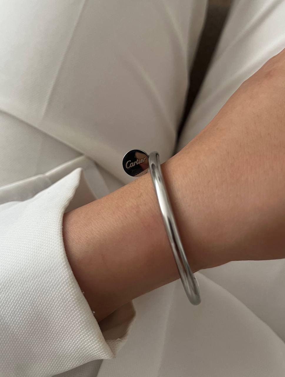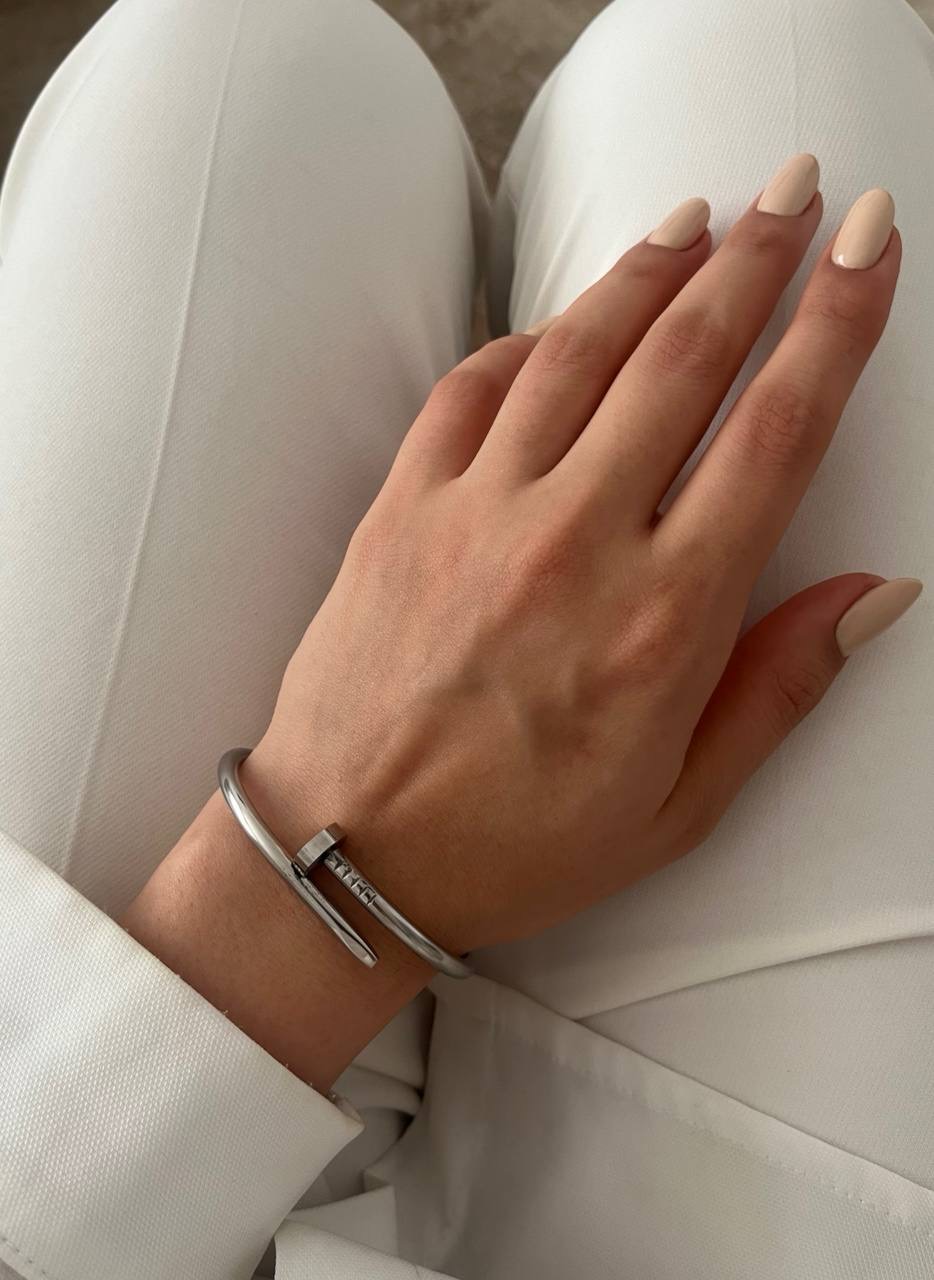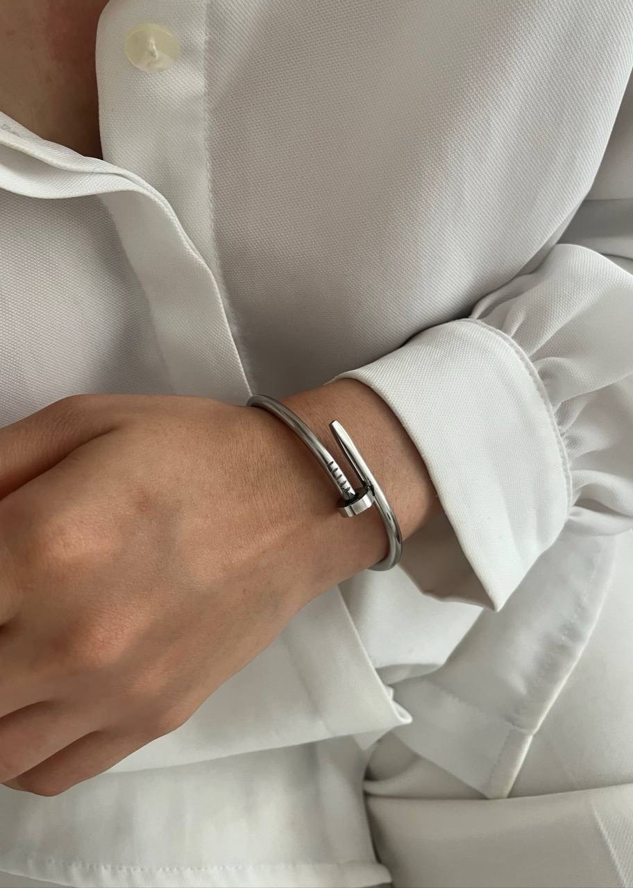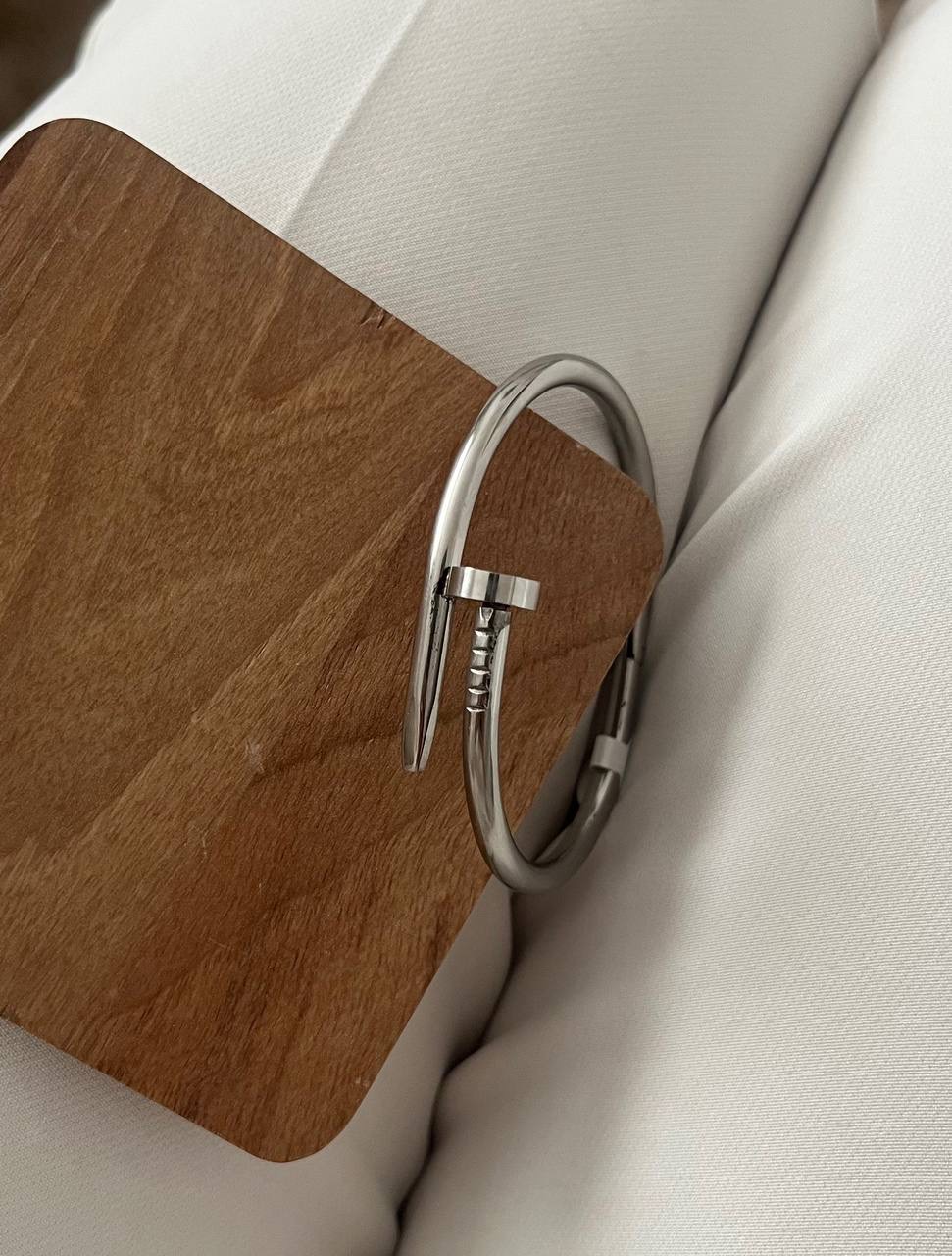 بنگل یا دستبند میخی استیل که حک برند داره.کاملا اسپرت و مناسب استفاده روزانه میباشد.مناسب مچ های ظریف و متوسط میباشد.