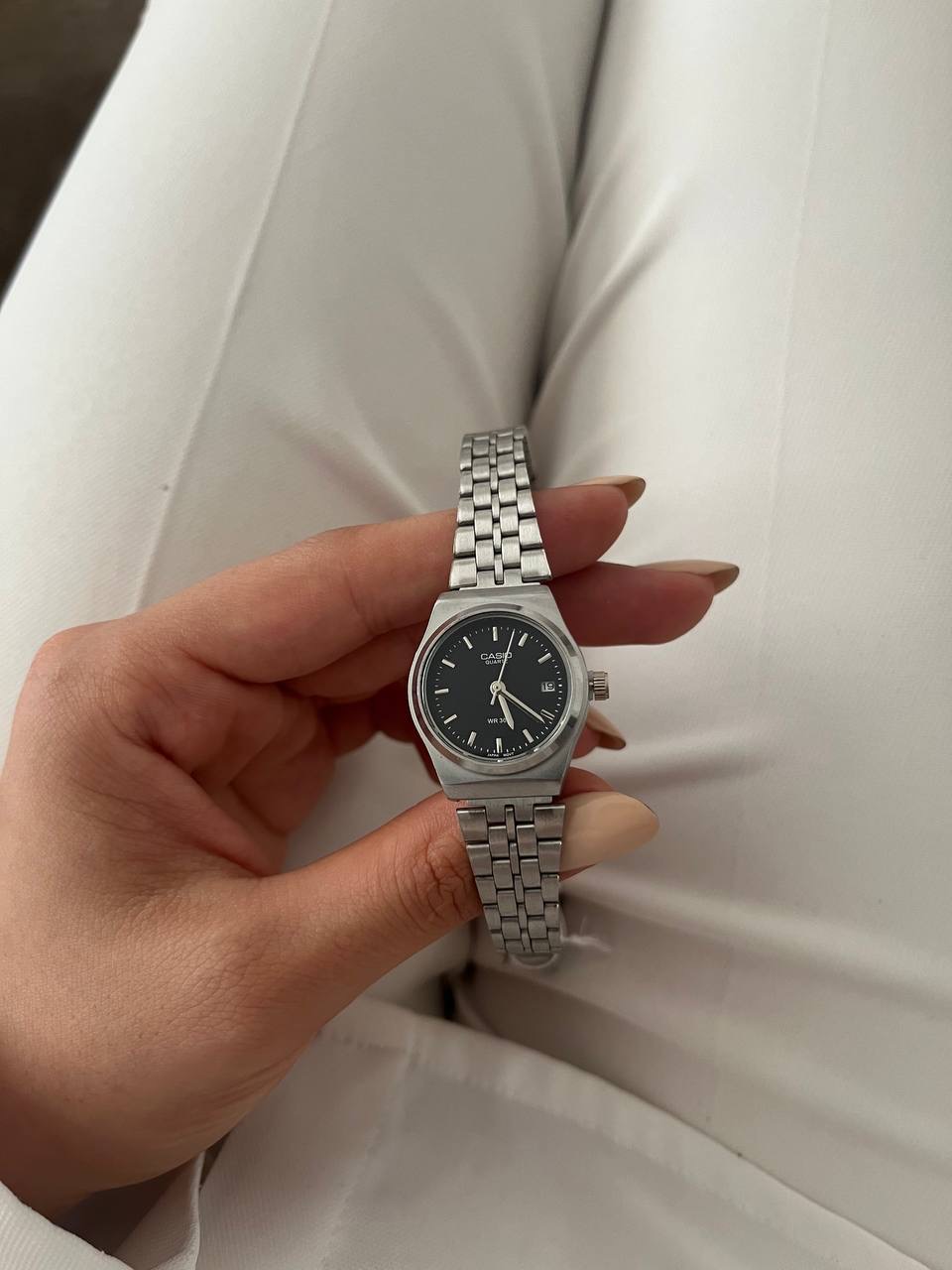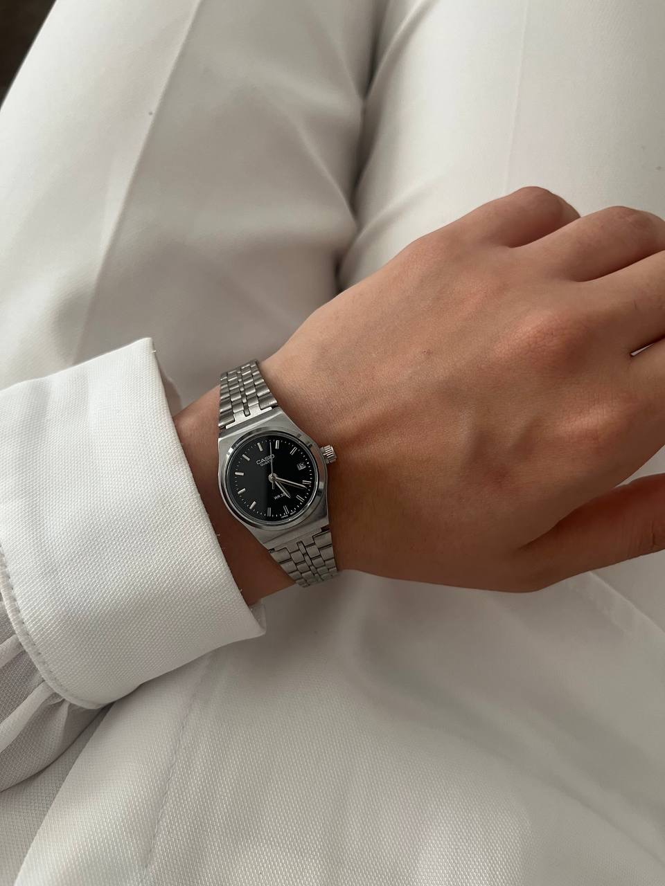 ساعت بند استیل رنگ سیلور طرح کاسیو.صفحه گرد با موتور شرکتی باتری خور درجه یک.
