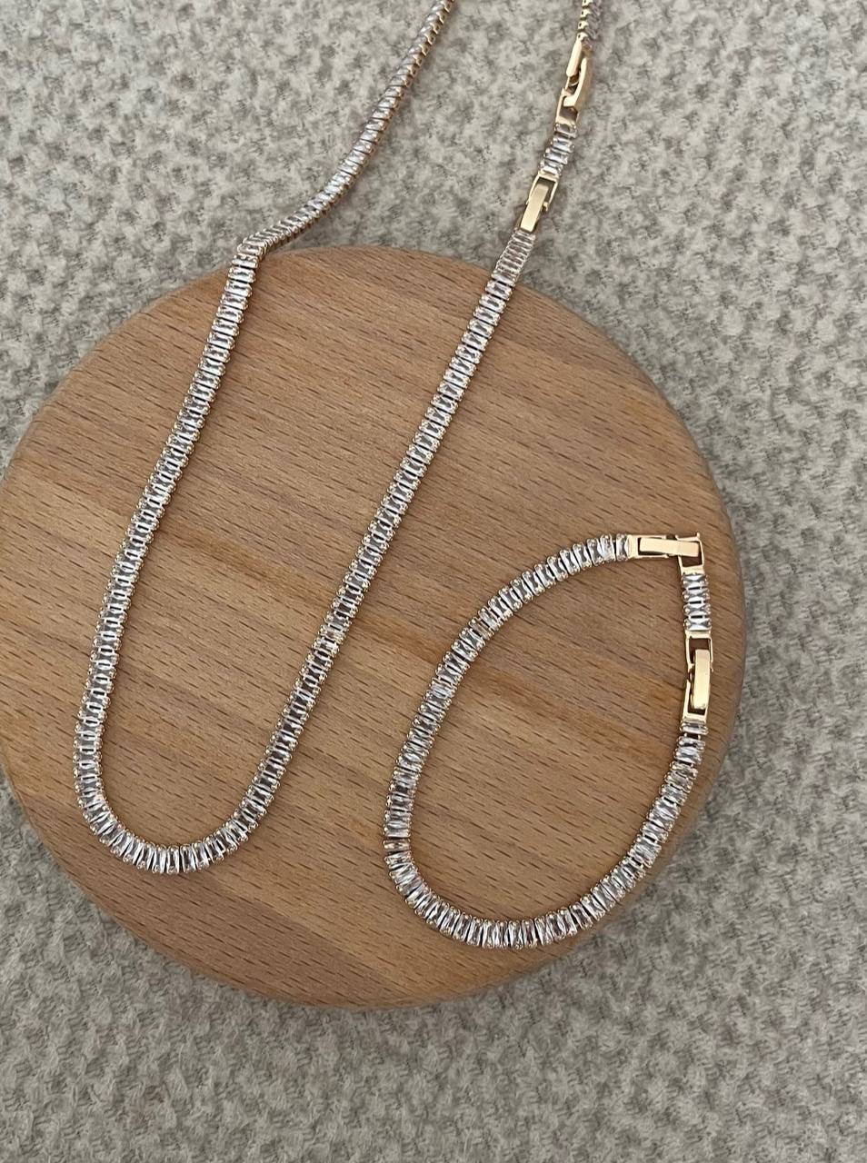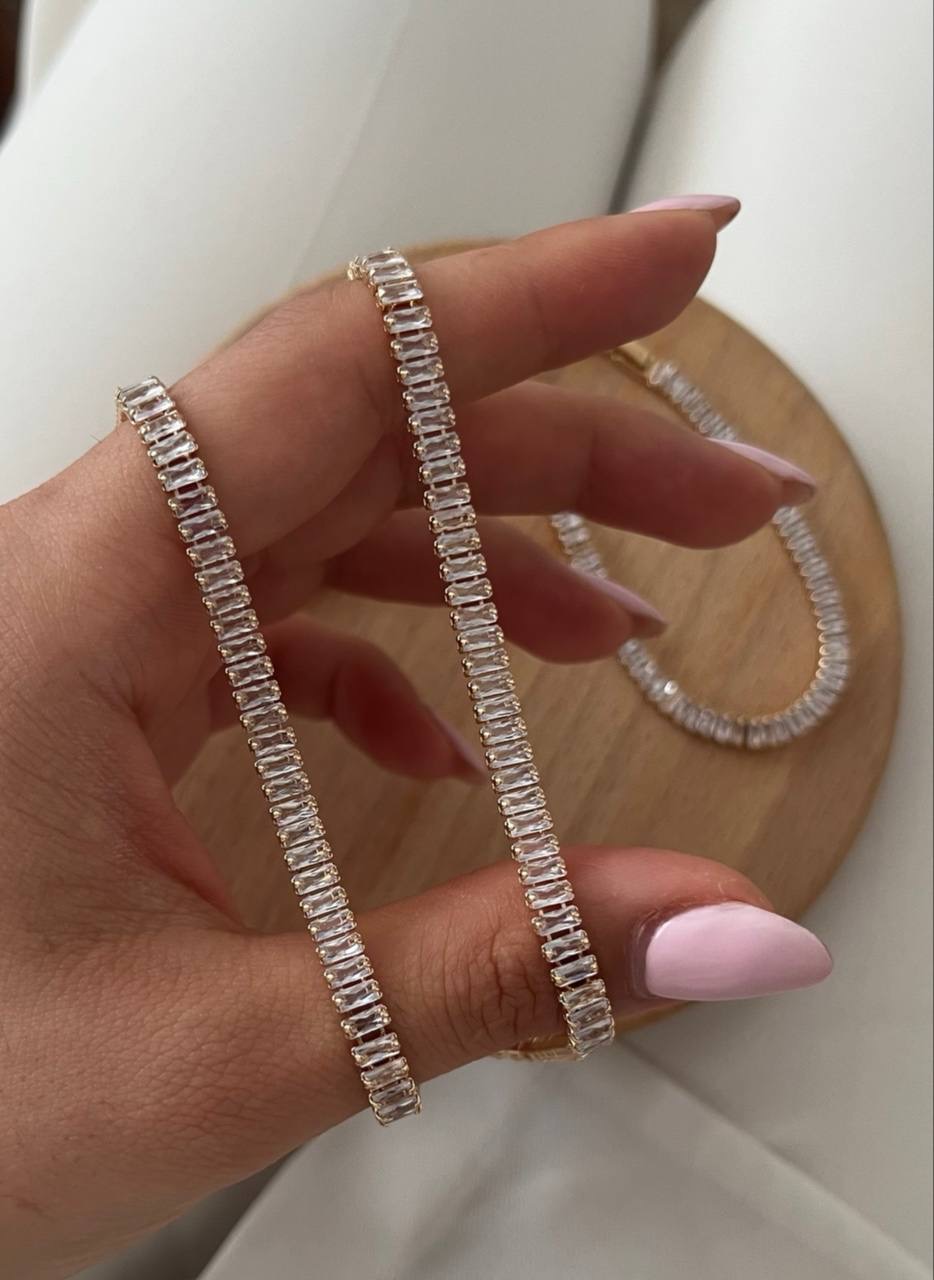 نیم ست زنانه تنیسی طلایی که شامل گردنبند و دستبند میباشد.از برند ژوپینگ و ضداب و ضدحساسیته.مناسب استفاده روزانه و مهمانی میباشد.