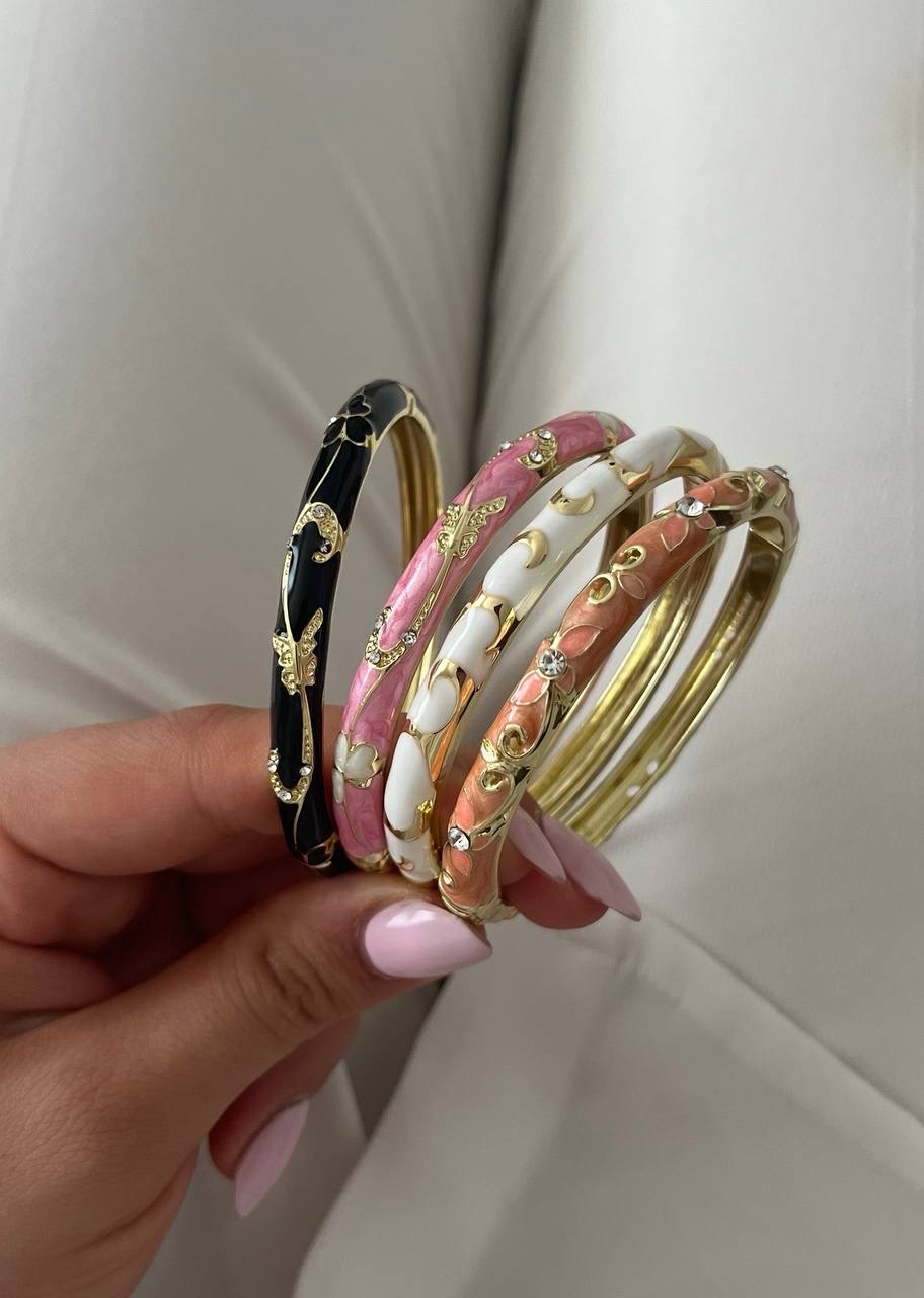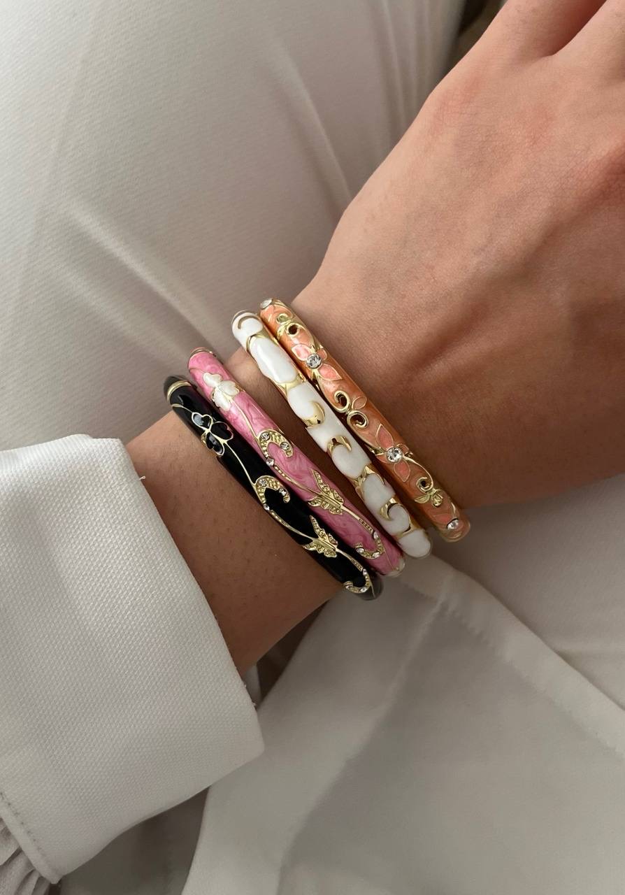 بنگل های میناکاری استیل با رنگبندی و طرحی خاص.مناسب استفاده روزانه.از بغل بازوبسته میشوند.مناسب مچ های ظریف.نگین دار و نگین کار شده میباشد.