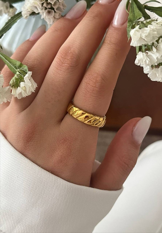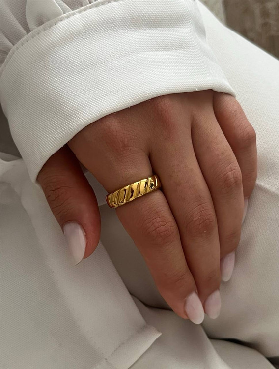 انگشتر مینیمال حلقه ای طرح دار زنانه از برند استیل که ضداب و رنگ ثابت است.مناسب استفاده روزانه و جایگزین حلقه میباشد.دارای سایزبندی میباشد.