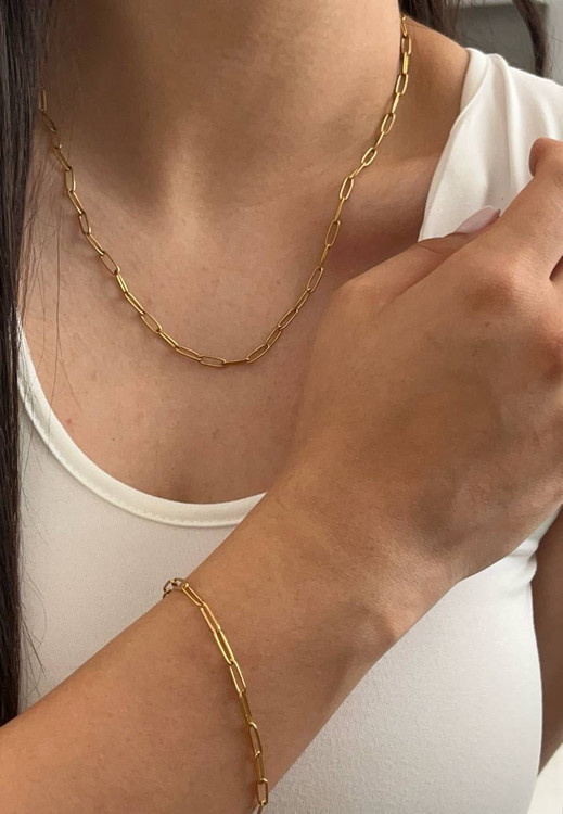 نیمست فول استیل ظریف طلایی دخترانه که کاملا رنگ ثابت است.مناسب استفاده روزانه است.همیشه میتونه همراهت باشه.گردنبند45 سانت و دستبند 17 سانت است با 5سانت زنجیر تنظیم.