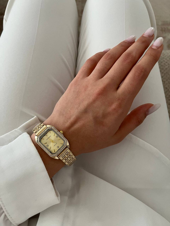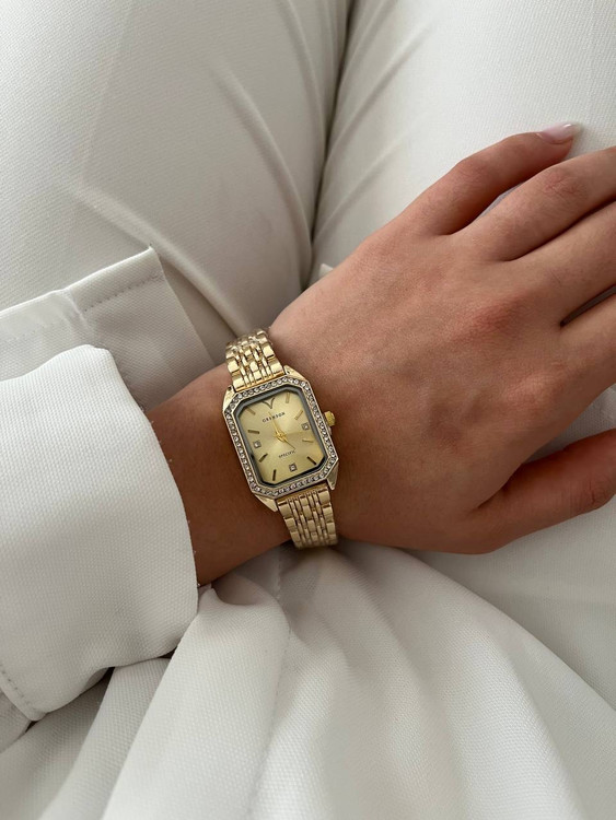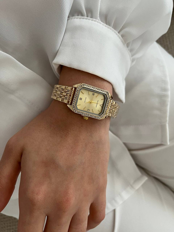 ساعت طلایی زنانه دور نگین صفحه مربعی استیل برند orenson