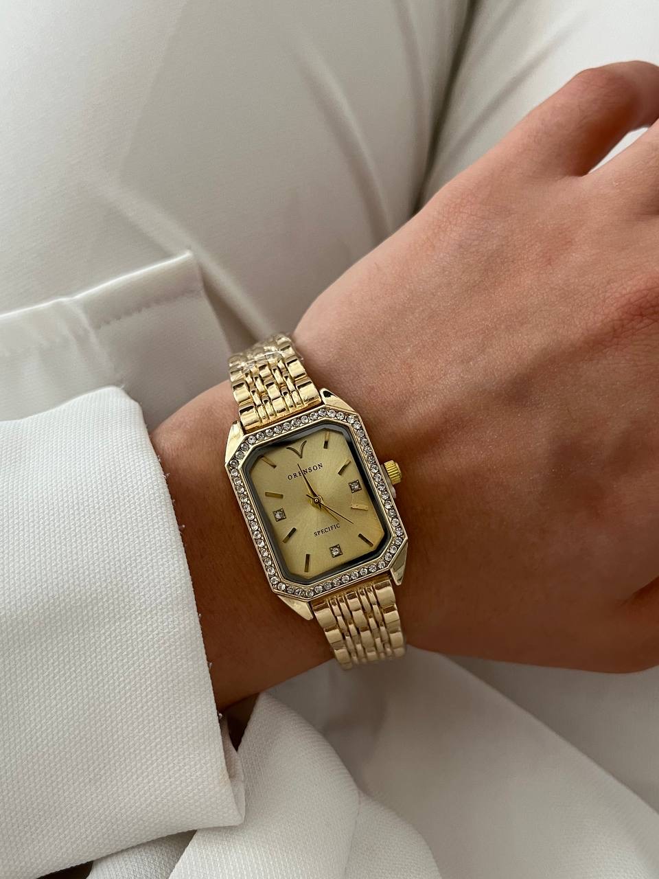 ساعت طلایی زنانه دور نگین صفحه مربعی استیل برند orenson