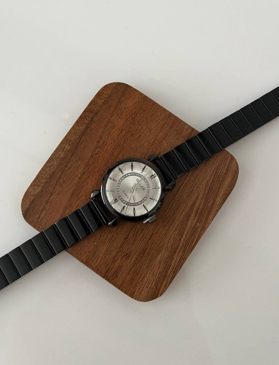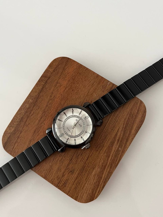 ساعت مشکی رنگ ,بند کرکه ای استیل برند والار دخترانه.جنس قاب صفحه استیل و ضداب است.باتری کوارتز قابل تعویض.بند ان کرکره ای قابل تنظیم در منزل میباشد.صفحه گرد و مینیمال میباشد و یک انتخاب مناسب برای بانوان شیک پوش است.