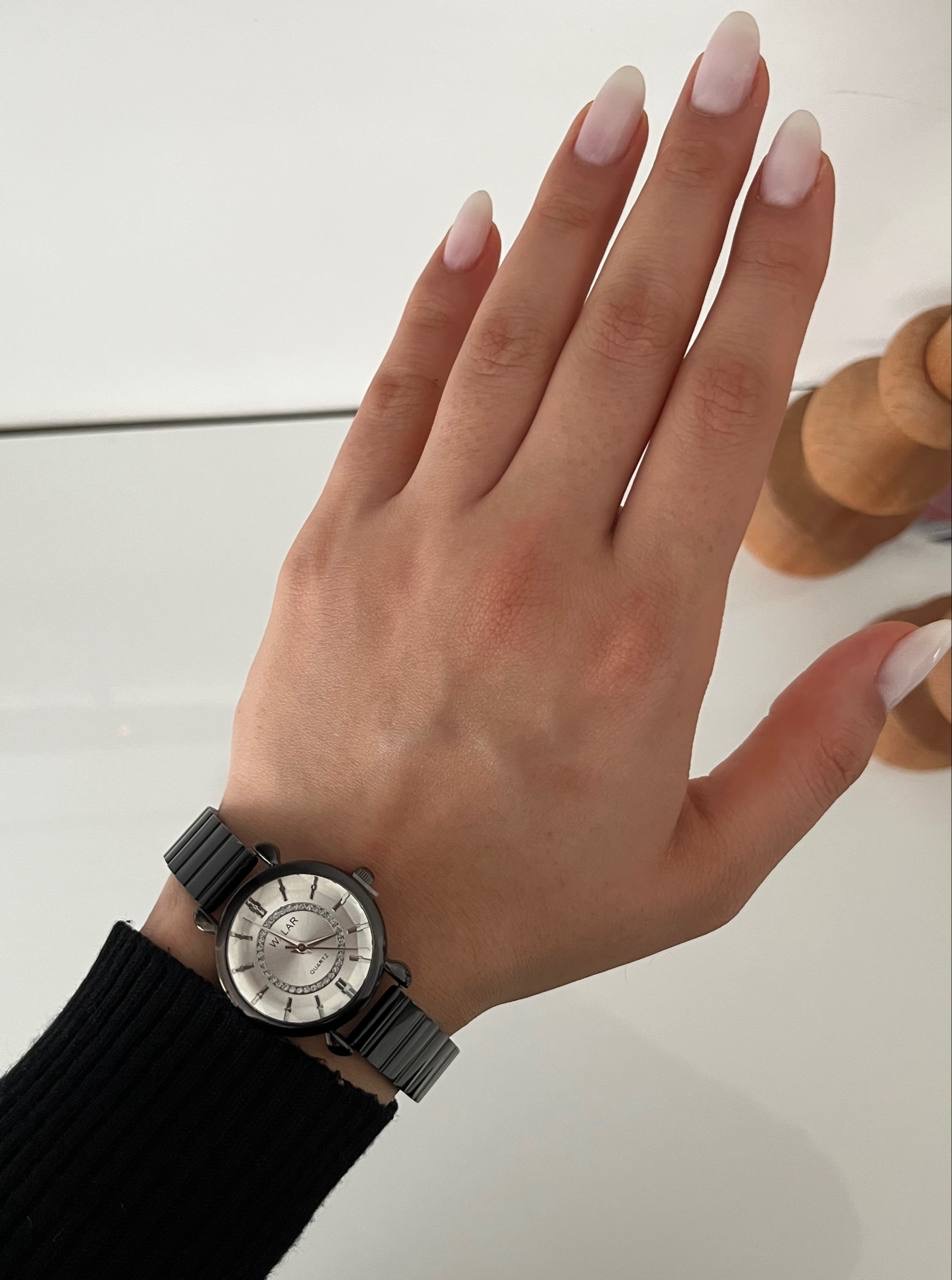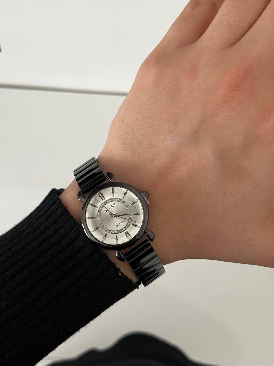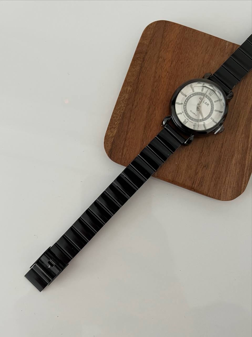 ساعت مشکی رنگ ,بند کرکه ای استیل برند والار دخترانه.جنس قاب صفحه استیل و ضداب است.باتری کوارتز قابل تعویض.بند ان کرکره ای قابل تنظیم در منزل میباشد.صفحه گرد و مینیمال میباشد و یک انتخاب مناسب برای بانوان شیک پوش است.