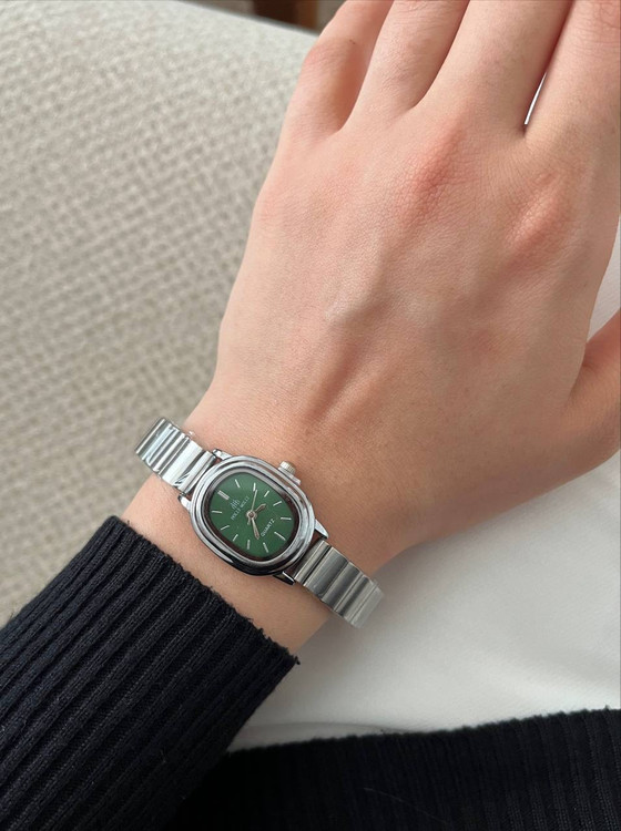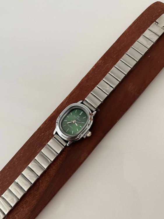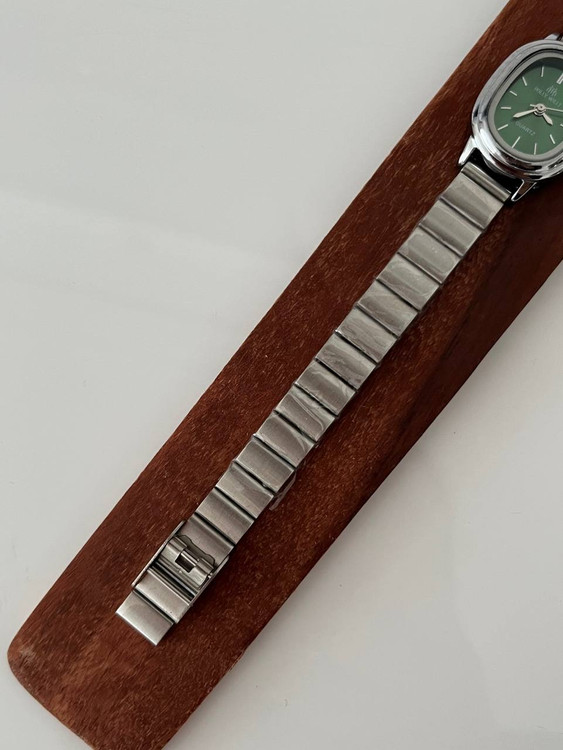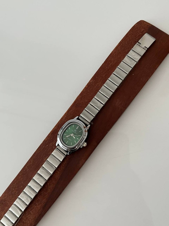 ساعت صفحه ریز سبز رنگ بند کرکه ای استیل برند هولی مولی اصل سیلور زنانه.جنس قاب صفحه استیل و ضداب است.باتری کوارتز قابل تعویض.بند ان قابل تنظیم در منزل میباشد.صفحه ان بسیار ریز و مینیمال میباشد و یک انتخاب مناسب برای بانوان شیک پوش است.