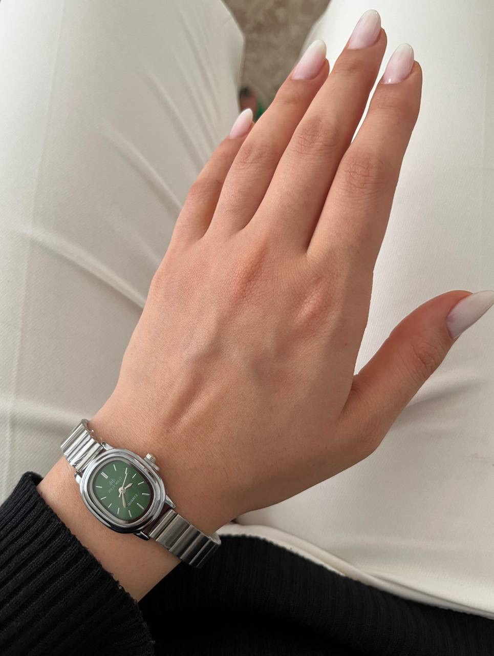 ساعت صفحه ریز سبز رنگ بند کرکه ای استیل برند هولی مولی اصل سیلور زنانه.جنس قاب صفحه استیل و ضداب است.باتری کوارتز قابل تعویض.بند ان قابل تنظیم در منزل میباشد.صفحه ان بسیار ریز و مینیمال میباشد و یک انتخاب مناسب برای بانوان شیک پوش است.