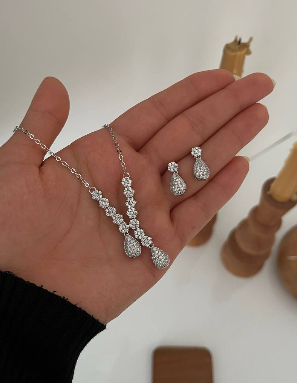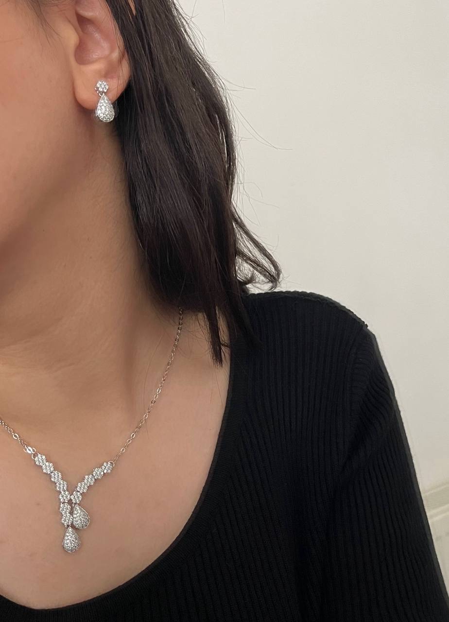 نیمست جواهری مجلسی زنانه رنگ سیلور که شامل گوشواره و گردنبنداست.گردنبند45 سانت است.قابل ست کردن با استایل های مهمانی.ابکاری بسیار فوق العاده و با دوام.