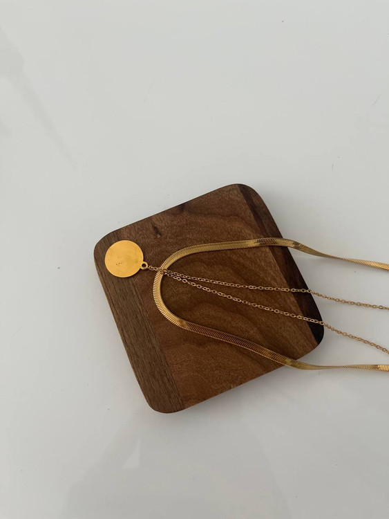 گردنبند دو لاین طلایی تمام استیل و رنگ ثابت زنانه.به صورت روزانه قابل استفاده است و هیچ گونه تغییر رنگی ندارد.لاین اول 45 سانت و لاین دوم50 سانت است.